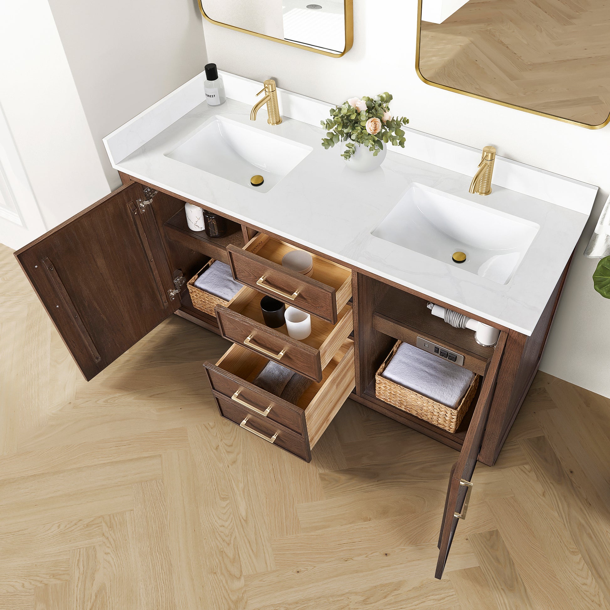 Upgrade your bathroom with the Jakarta 60 Freestanding Double Bath Vanity in Aged Dark Brown Oak with Silk White Quartz Stone Top today.