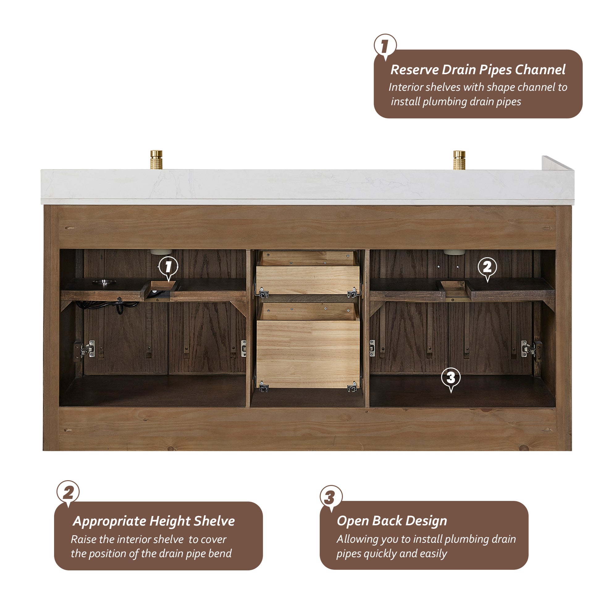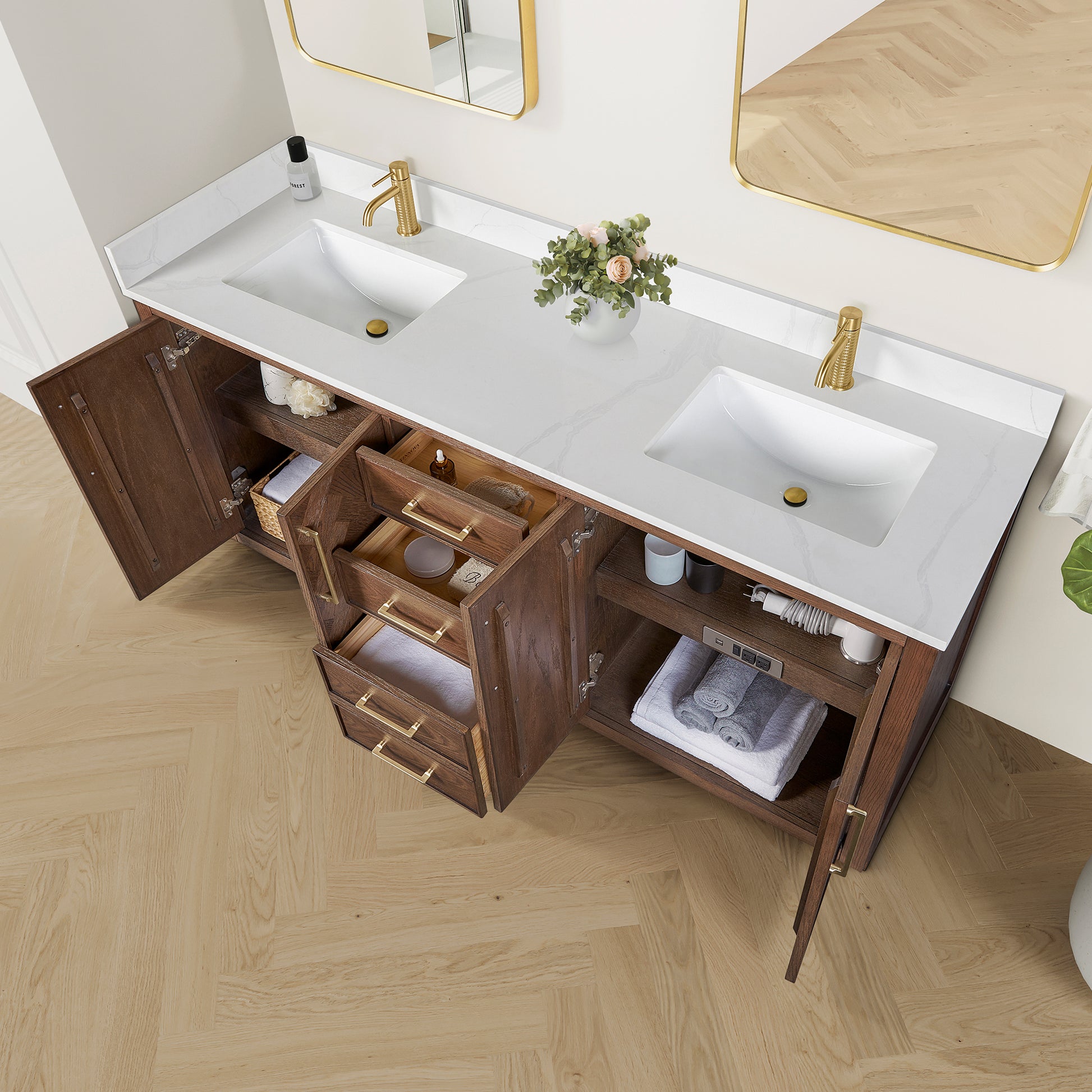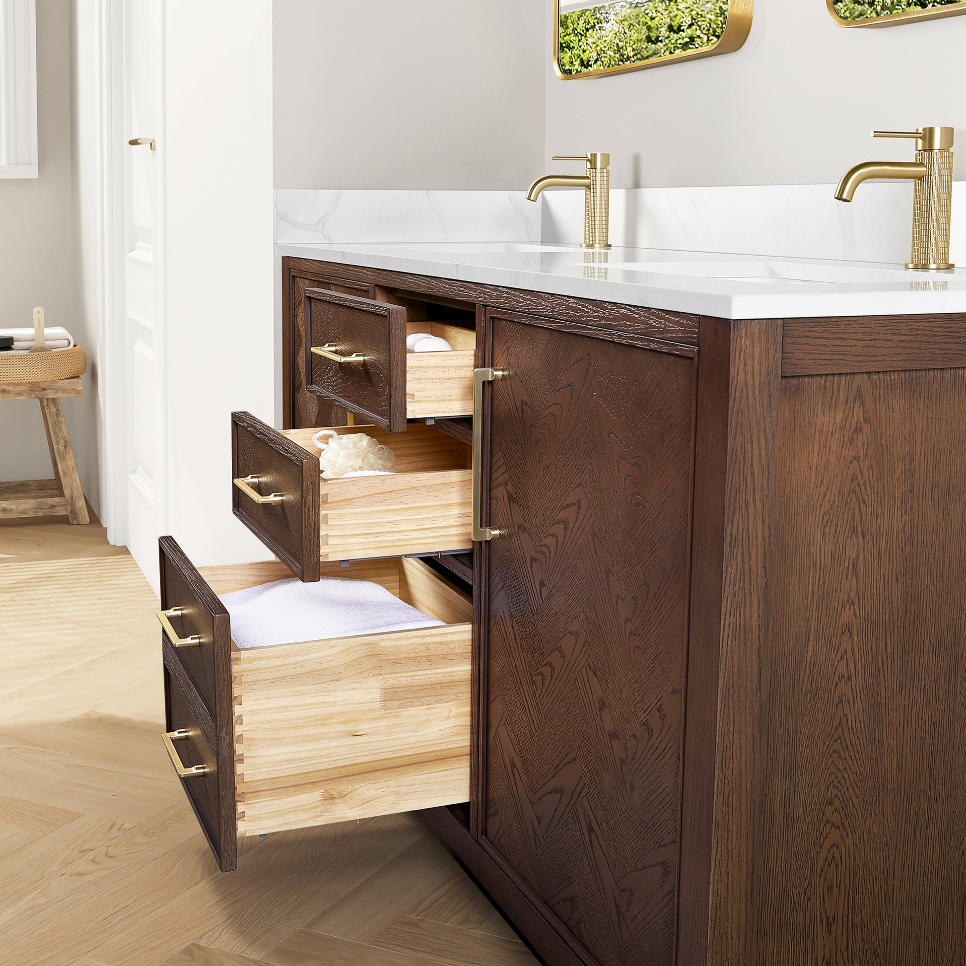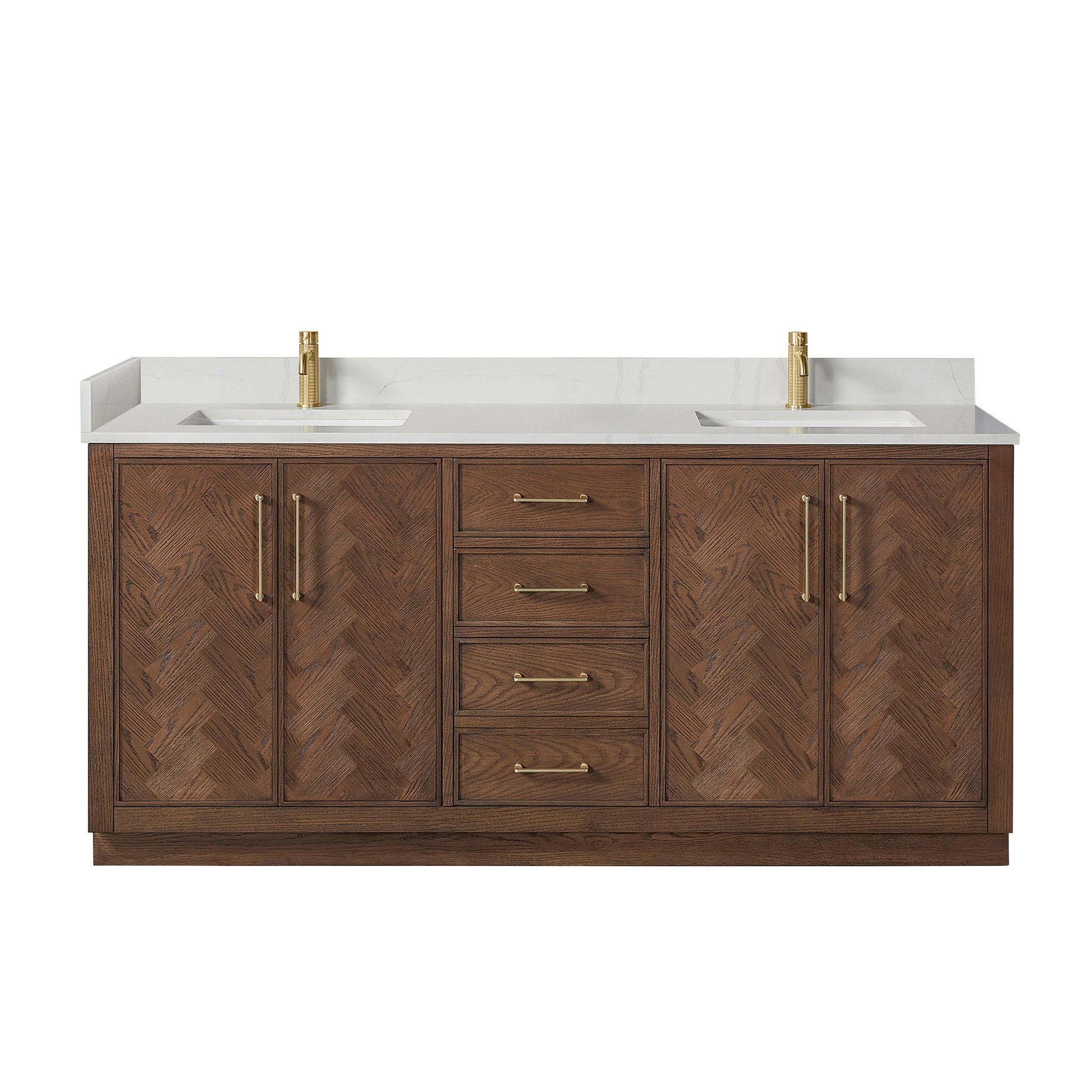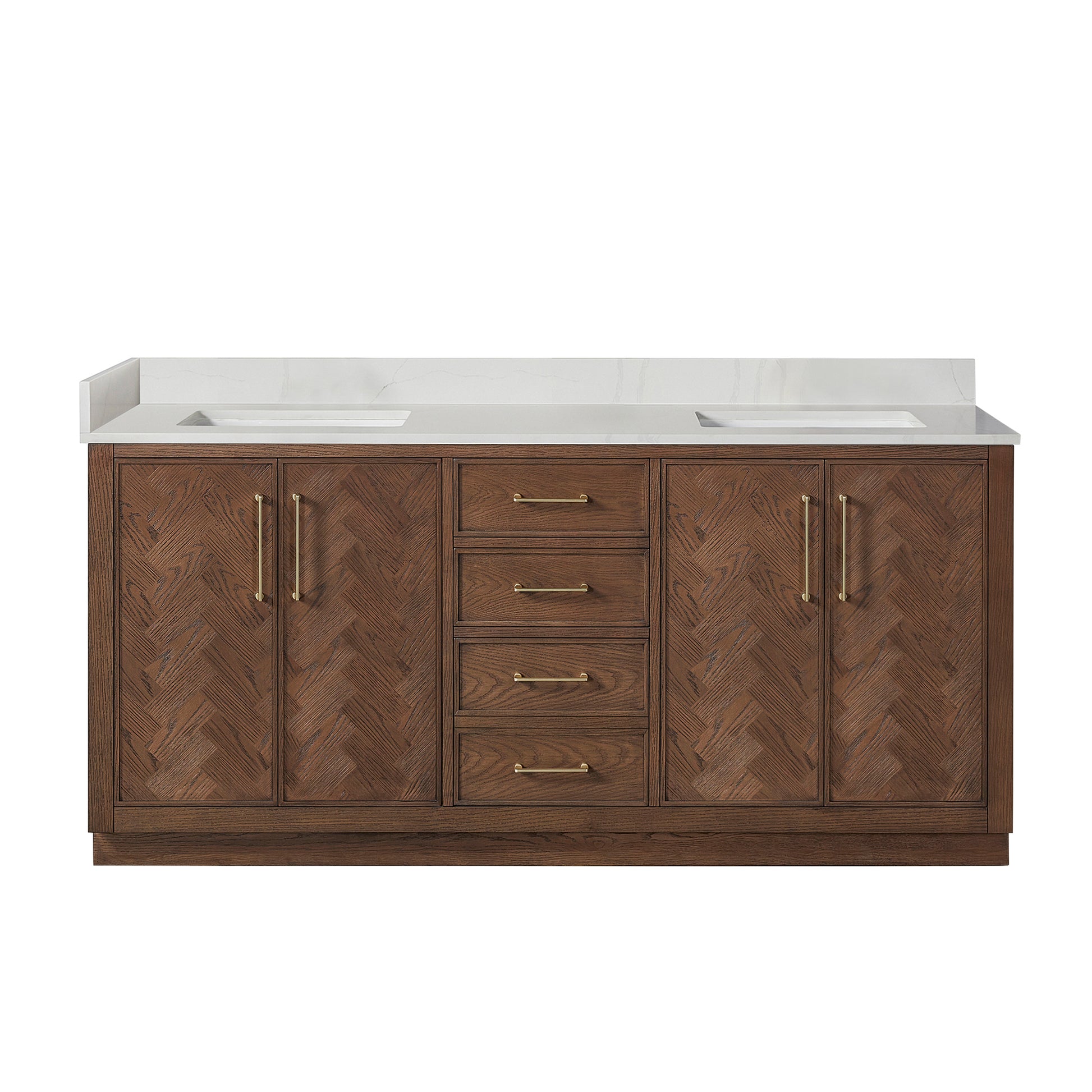 Upgrade your bathroom with the Jakarta 72 Freestanding Double Bath Vanity in Aged Dark Brown Oak with Silk White Quartz Stone Top today!